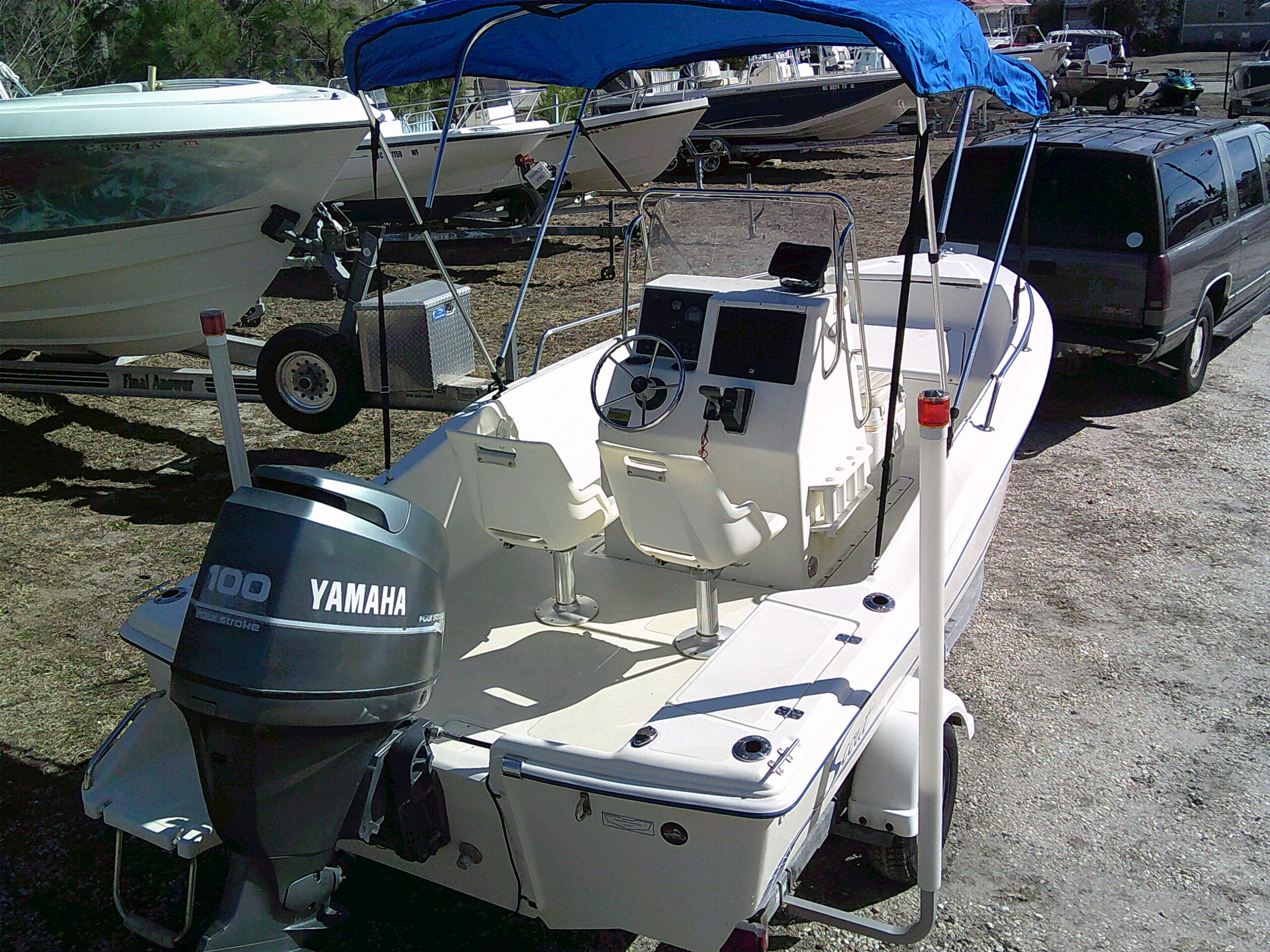 Boat Features: Large Forward Platform, Perfect for Throwing a Cast Net, Fishing or Sunning / Anchor Locker w/Anchor, Chain, Line / Large Forward Storage Box / Forward of Console Cushioned Seat/Cooler w/Back Rest / Grab Rails / Console w/Wind Screen, Grab Rails, Storage, Stainless Steel Helm and Electrical Box / Two Cushioned Swivel Helm Charis / 4 In Gunnel Rod Holders / Two Aft Storage Boxes / 2 Batteries w/Switch / Self Bailing Deck / Swim Platform w/ladder.