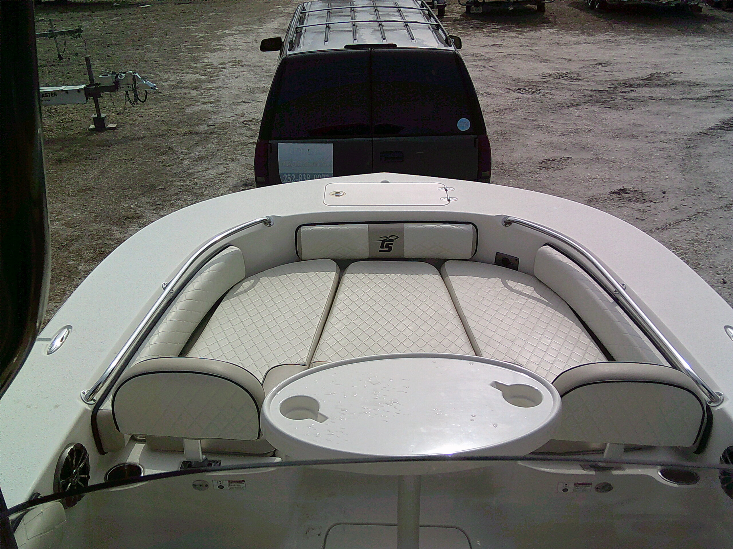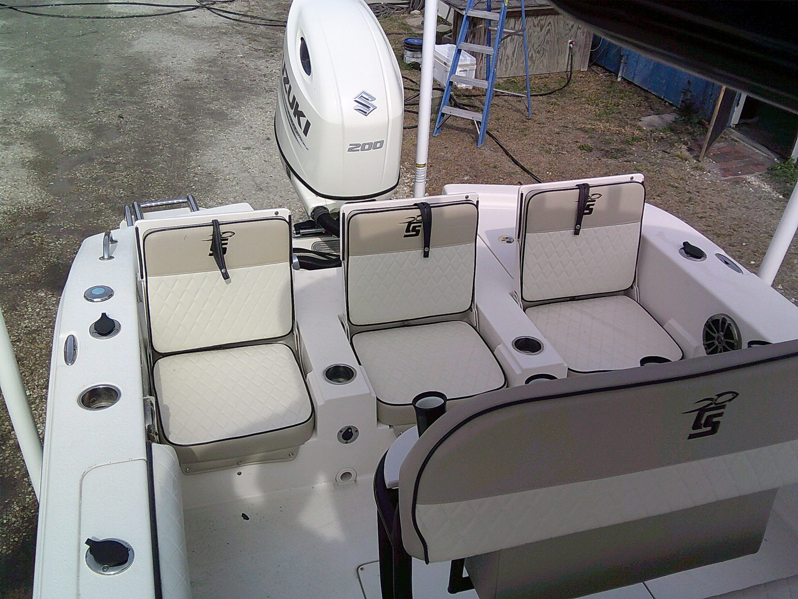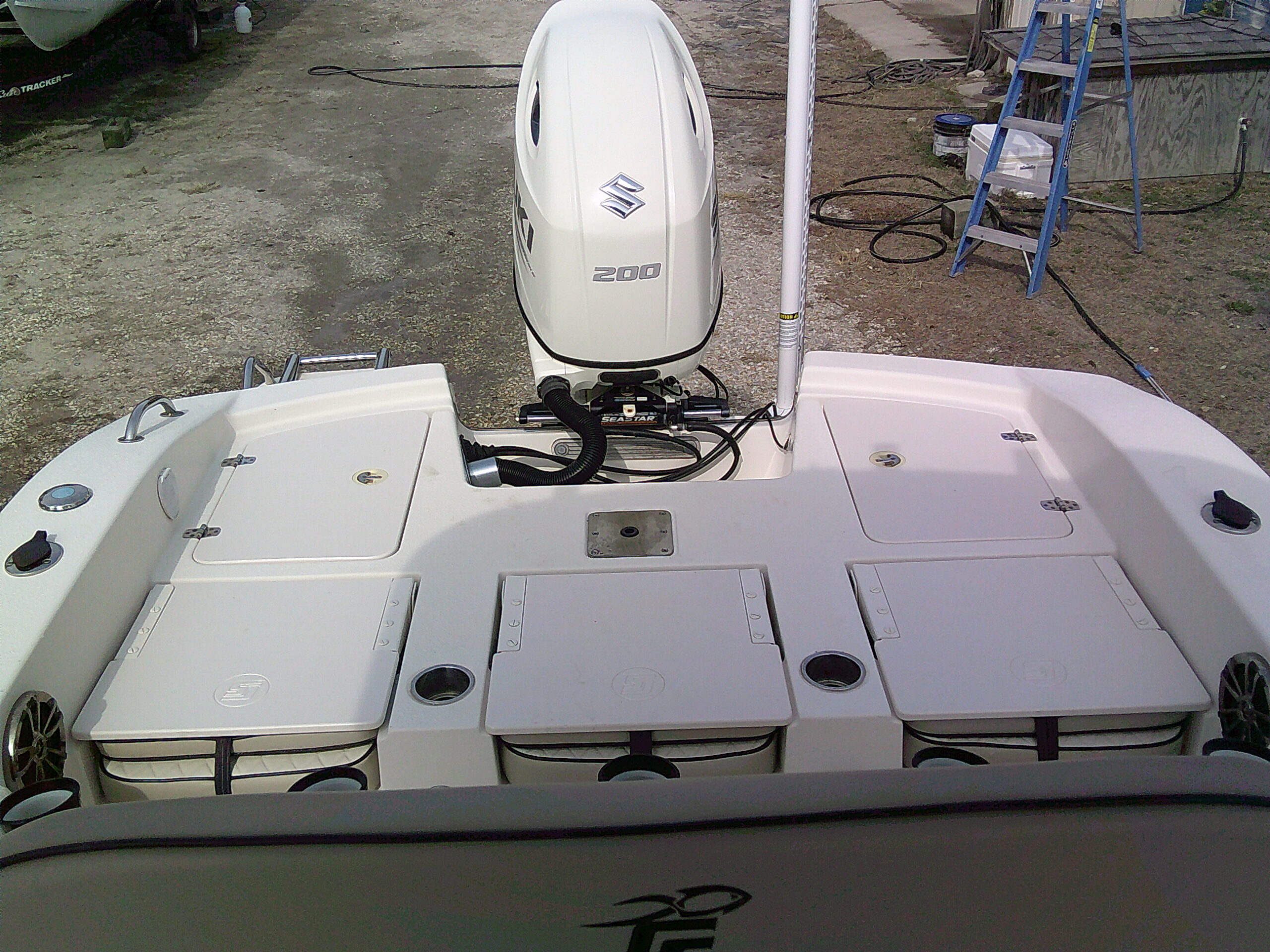 Vessel Info: Bow Deck w/Anchor Locker w/Anchor, Chain, Line / Foward Platform w/Cushioned Seating, Removable Back Rest, 2 Storage Boxes, Grab Rails, Cup Holders, 2 Speakers, Courtesy Lights, Removable Cushioned Fishing Chair / Forward in Deck Storage Box w/Table Mount for Removable Table / Forward of Console Cushioned Seat w/Back Rest, Grab Rails, Walk-in Opening to Console Storage w/Privacy Curtain / Powder Coated Hardtop w/Electrical Box, Grab Rails, 4 Speakers, Lighting, 4 Rod Holders / Console w/Wind Screen, Grab Rails, Gauges, Controls, Switch Panel, 2 Cup Holders, Stainless Steel Tilt Helm w/Hydraulic Steering and Knob, Folding Foot Rest, Console Storage w/Porty Potty (No Shown in Pictures) / Cushioned Leaning Post w/Storage, 5 Rod Holders, Tackle Station, Cooler Storage / Coaming Cushions / 8 in Gunnel Rod Holders, Under Gunnel Rod Storage Self Bailing Deck / Large Aft Platform w/3 Cushioned Jump Seats w/Back Rest and Storage, 2 Speakers, Cup Holders, Courtesy Lights, Removable Cushioned Fishing Chair / RAW Water Washdown, Battery Switch, Fresh Water Shower, Storage Box, Live-Well, Swim Platform w/Folding Ladder / Blade Power Pole